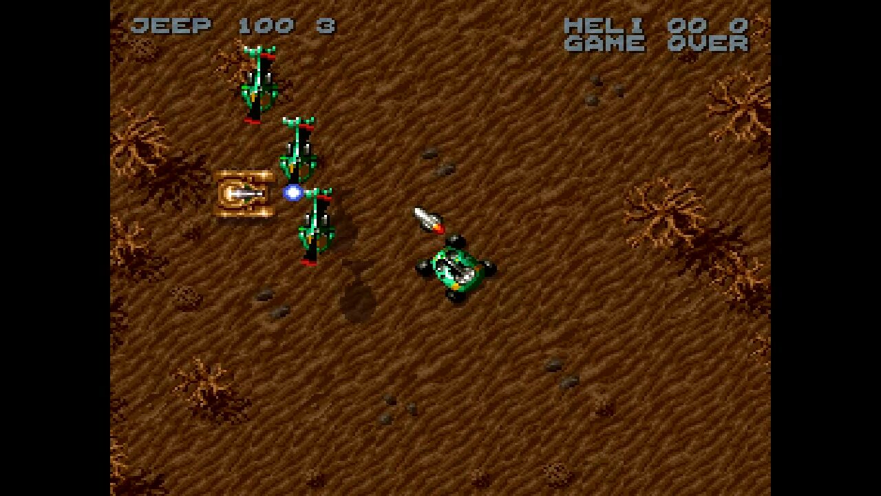 一見、よくあるシューティングゲームに見えるが、自機としてヘリの他にジープを選べるのがユニーク。ヘリは地上物の、ジープは空中物の影響を受けないためゲーム性が大きく変化する。日本では配信・移植等はいっさい行われていないが、完品にこだわらなければスーファミ版の入手はそこそこ容易。隠れた良作。